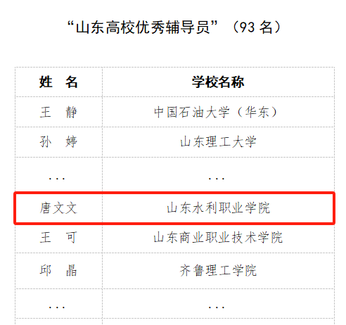 近日,中共山东省委教育工作委员会发布《2023年度“山东学校思政课教师年度人物”和“山东高校辅导员年度人物”宣传选树活动评选结果公示》,学院辅导员唐文文获评“山东高校优秀辅导员”称号。