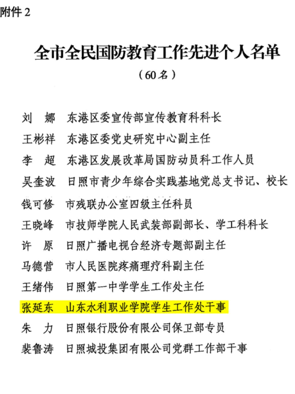 近日,中共日照市委宣传部、日照军分区政治工作处公布了2023年全市全民国防教育工作先进单位和先进个人名单,学院教师张延东获“全市全民国防教育先进个人”称号。