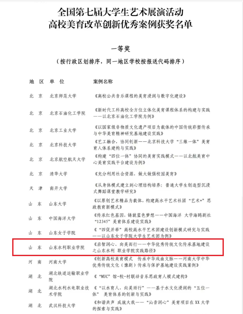 6月17日,由教育部、湖北省人民政府主办的全国第七届大学生艺术展演活动在湖北襄阳落幕。学院《启智润心、向美而行——中华优秀传统文化基地建设之精品人妻系列无码人妻免费视频实践路径》获全国高校美育改革创新优秀案例一等奖,是山东省唯一一所获此殊荣的职业院校,创造了学院在该赛事国赛上的历史最好成绩。