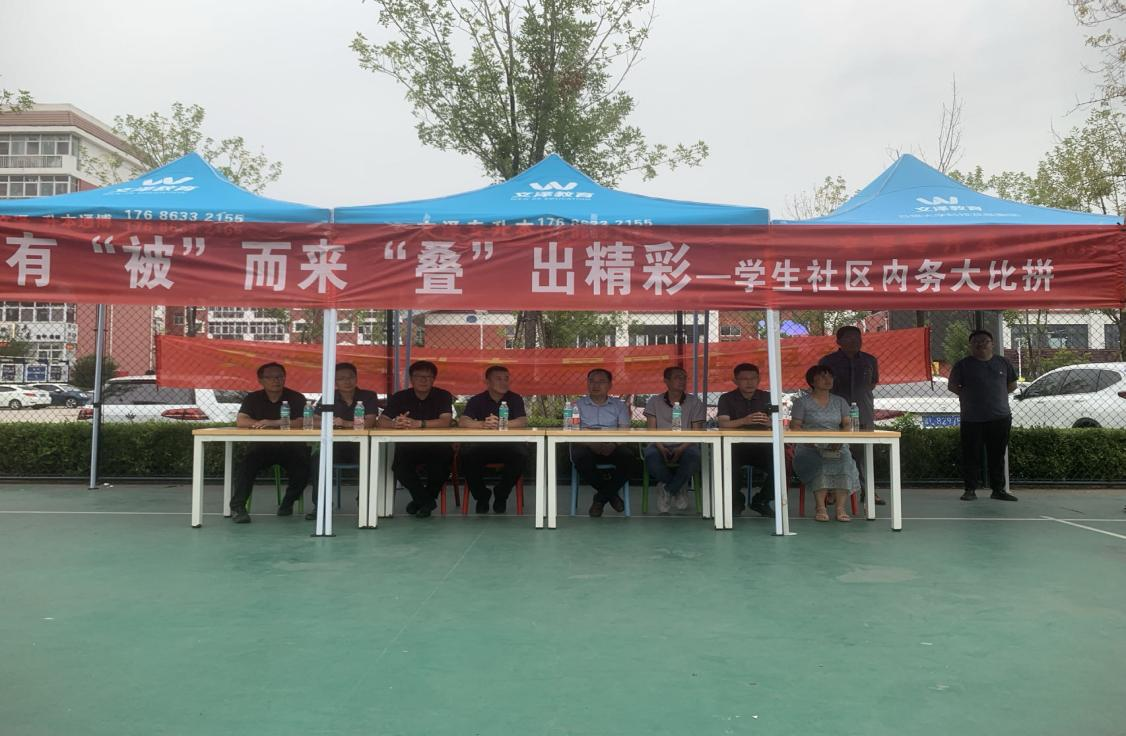 比拼现场,同学们全神贯注,一床床被子在同学们的手下,自由翻折,方方正正,有棱有角,变成了排列整齐的“豆腐块”。这里的每一条折痕都凝聚着他们的努力,每一个角度都彰显着他们的认真。评委老师们根据被子的角、边、线、面的整齐情况,秉着“公平、公正、公开”的原则,对同学们的“作品”进行现场打分。