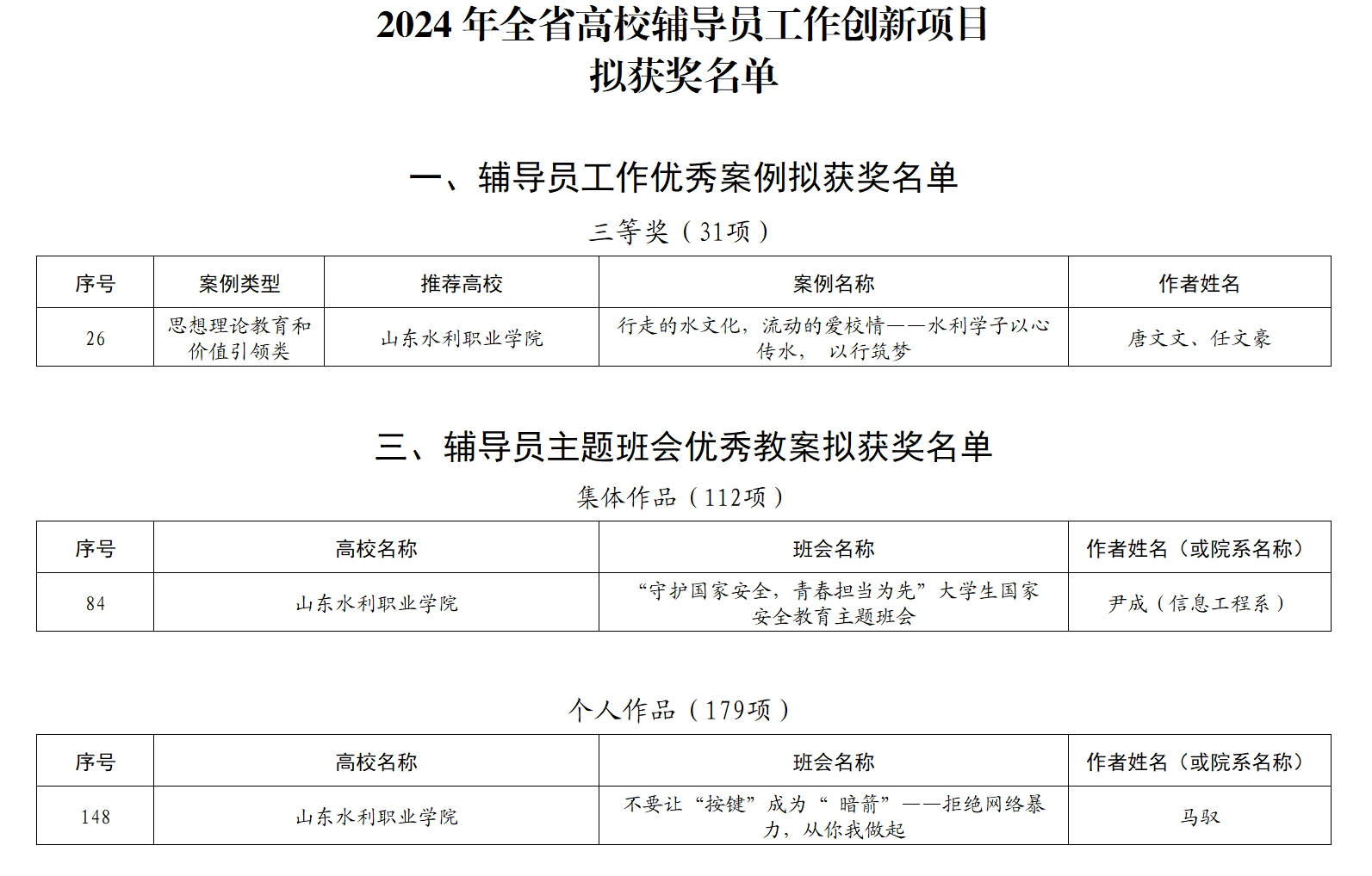 近日,中共山东省委教育工委公布2024年全省高校辅导员工作创新项目获奖名单,学院获辅导员工作优秀案例三等奖1项,辅导员主题班会优秀教案集体作品1项、个人作品1项。
