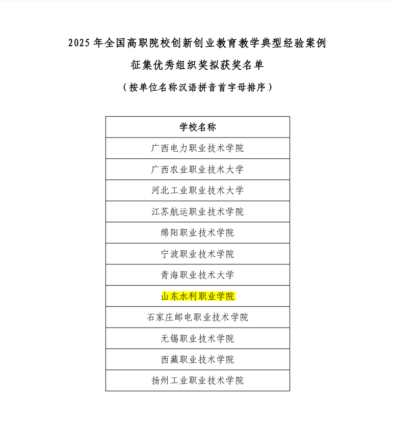近日,全国高等职业院校创新创业教育联盟公布了2025年全国高职院校创新创业教育教学典型经验案例评选结果,学院荣获全国高职院校创新创业教育教学典型经验案例征集优秀组织奖,同时在案例评选中斩获一等奖一项、二等奖三项、三等奖一项。