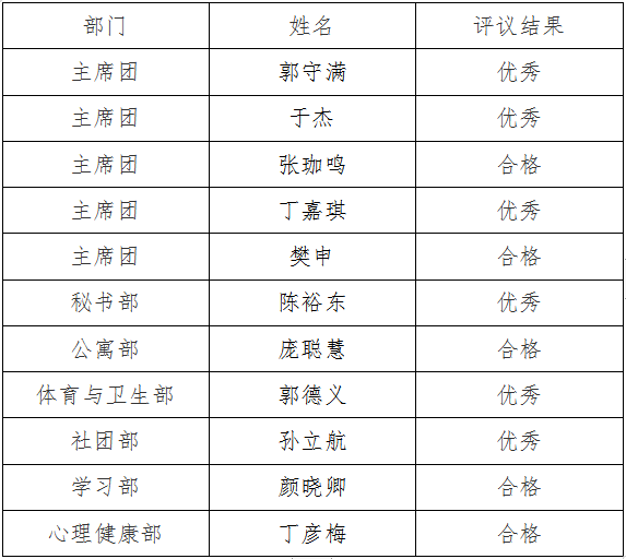 根据《山东水利职业学院学生组织改革方案》,学校组建了以学生代表为主,学生工作处、校团委等共同参与的评议会,并于近期对校学生会工作人员进行了述职评议。现将2020——2021学年第一学期学生会述职评议结果进行公示。公示期为3个工作日,自2020年12月7日至2020年12月9日。公示期间,如对公示结果有异议者,请及时向校团委反映。