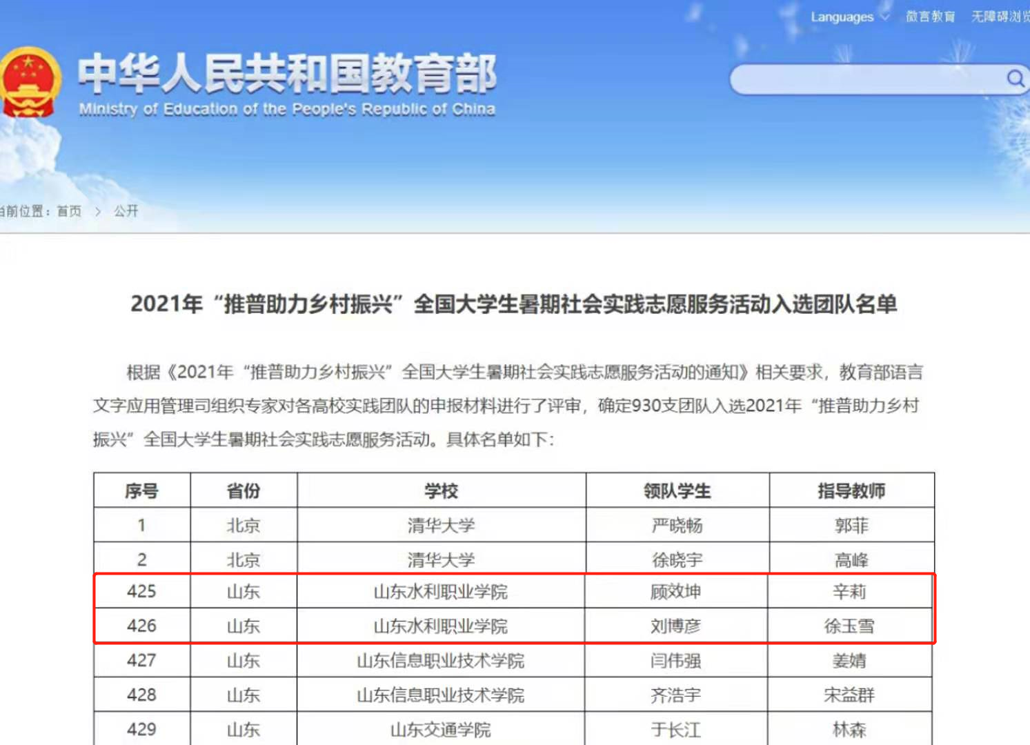 日前,教育部公布了2021年“推普助力乡村振兴”全国大学生暑期社会实践志愿服务活动入选团队名单,我校水利工程系“水利推普小分队”和信息工程系“情暖黄河口”两支团队成功入选。