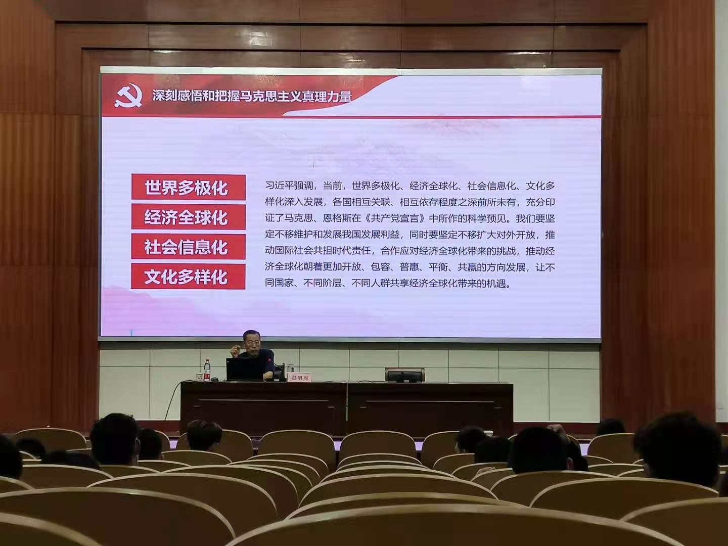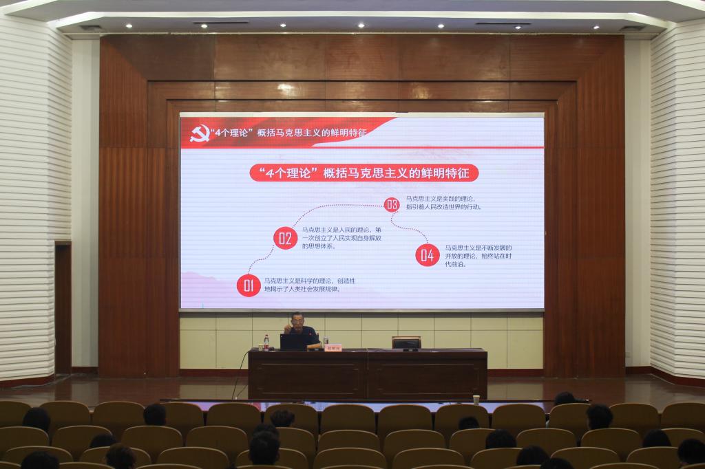 学院党委副书记赵明阁以《马克思与马克思主义》为题,结合自身理论研究,围绕马克思人物生平、马克思主要成就、《共产党宣言》简介、深刻感悟和把握马克思主义真理力量、纪念马克思诞辰200周年大会习近平发表重要讲话等六个方面进行全面阐述,系统指出中国共产党是用马克思主义武装起来的政党,马克思主义是中国共产党人理想信念的灵魂,新时代,我们仍要学习马克思,学习和实践马克思主义,将马克思主义与中国实际相结合,更有定力、更有自信、更有智慧地坚持和发展新时代中国特色社会主义。讲座内涵丰富、分析透彻、深入浅出,使大家对马克思主义和中国特色社会主义有了更为全面深刻的认识。