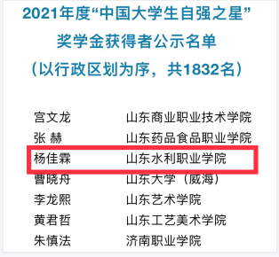 2021年度“中国大学生自强之星”奖学金推报活动由共青团中央、全国学联指导,中国青年报社、新东方教育科技集团、中国青年创业就业基金会联合举办。活动旨在树立当代大学生热爱祖国、品行优良、不畏艰难、自强不息的榜样。是我校持续优化人才培养模式,打造“水院人”工匠精神,促进学生全面发展显著成效的体现。