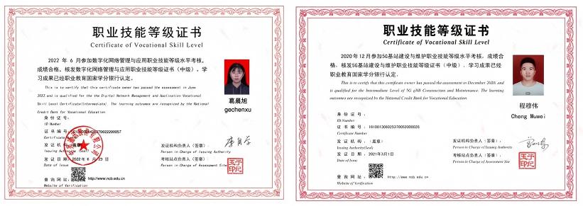 本专业学生可根据职业方向、岗位需求和学习兴趣选择考取集成电路开发与测试、传感网应用开发、单片机开发与应用职业、数字化网络管理、5G基站建设与维护等职业资格(技能等级)证书。