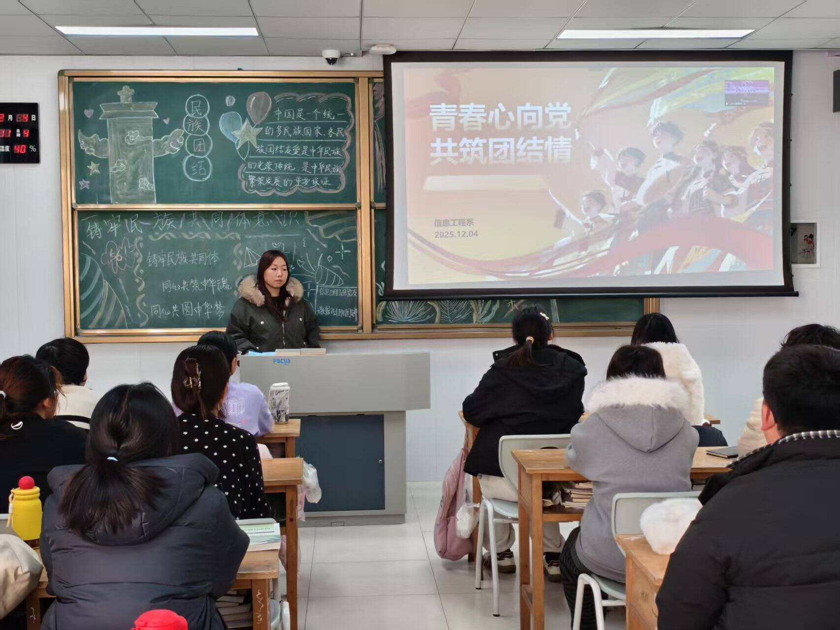 实践凝聚力量 彰显青春担当。12月4日下午,信息工程系各团支部以“青春心向党 共筑团结情”为主题开展特色团日活动。通过“民族团结知识闯关赛”“非遗文化体验角”等形式,向同学普及民族政策,录制《同心共筑中国梦》手势舞视频,用青春语言传递“中华民族一家亲”的温暖力量。