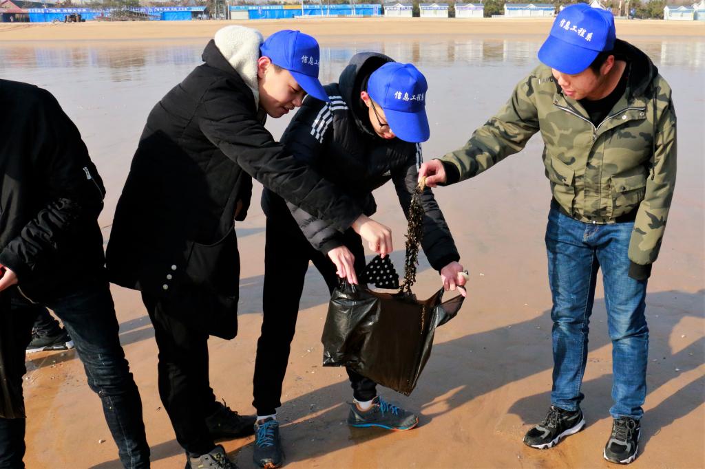 时值寒冬,海风凛冽,却挡不住志愿者们的劳动热情。大家手持夹子,打着垃圾袋,分布在海岸线上、沿海防护林中,把捡拾到的纸屑、废旧塑料袋、玻璃碎片、烟头、各种饮料瓶等垃圾收集起来,集中运走。有些垃圾埋的比较深,志愿者们就用手把垃圾挖出来,坚决不留一丝垃圾在海滩上。劳动期间,不时有游客、市民向志愿者们投来了赞许的目光,有些市民和儿童也积极加入到沙滩环保活动中,主动捡起了身边的垃圾。