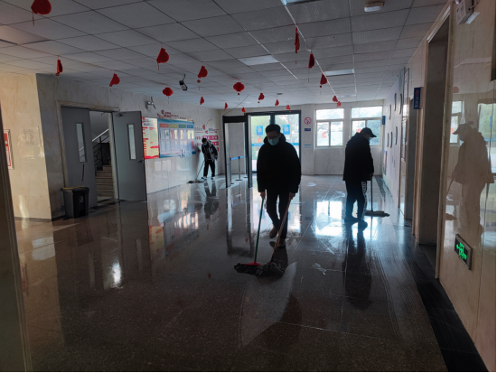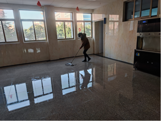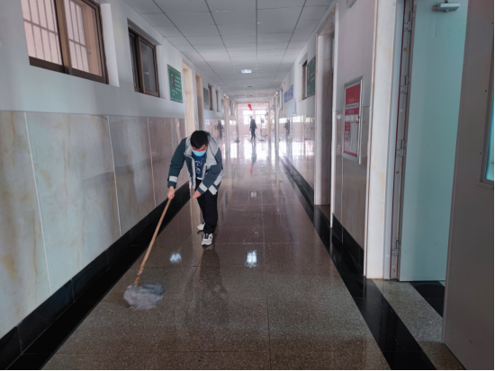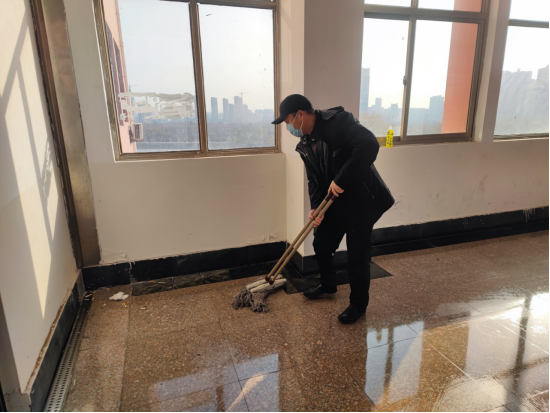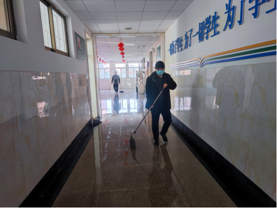 从一楼起,老师们仔细清扫着楼梯、楼道、大厅等各个区域,从两边到角落,一个灰尘点也不放过,大家同心协力、分工协作,以清洁地面重点,彻底清理卫生死角,喷洒消毒液,消除病媒生物孳生地,为打赢疫情防控阻击战营造良好卫生环境。