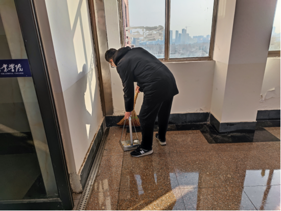 在连廊一角,资源与环境系副主任张伟首先来到一个偏僻的卫生死角,认真清理着下面的灰尘残垢、细心打扫着地面上的沙粒灰尘。