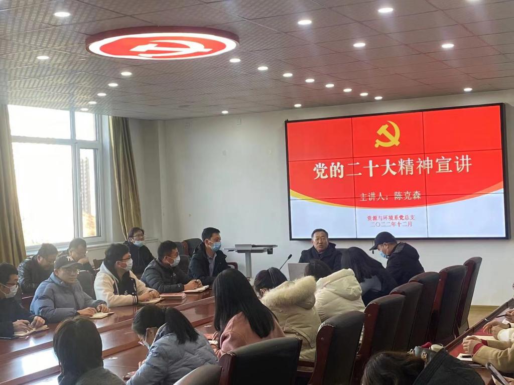 为深入学习贯彻党的二十大精神,团结引领全系师生自觉沿着习近平新时代中国特色社会主义思想指引的方向奋勇前进,12月15日下午,资源与环境系党总支开展学习党的二十大精神宣讲报告会,会议由系党总支书记陈克森主讲,全系预备党员、教师代表参加。