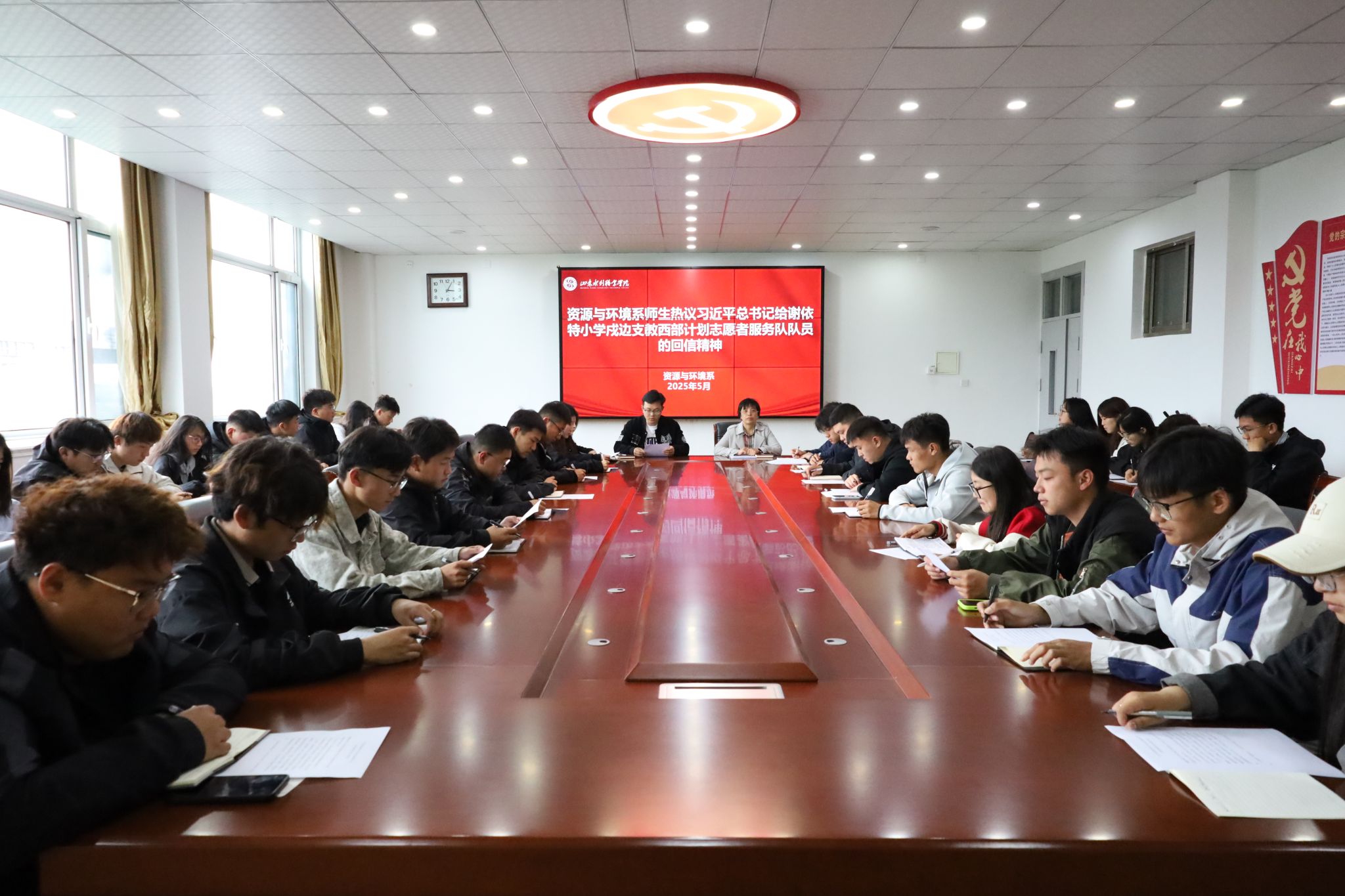 为引导学生树立远大理想、勇担时代重任,资源与环境系于5月9日开展师生热议习近平总书记给谢依特小学戍边支教西部计划志愿者重要回信精神。资源与环境系党总支副书记、全体学工人员、青年学生代表以及学生干部参加。