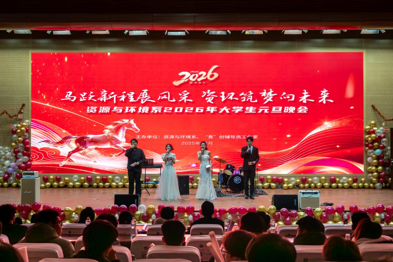 12月30日晚,资源与环境系“马跃新程展风采,资环筑梦向未来”2026年元旦晚会暨学生表彰大会在学术会议中心举办,资源与环境系学工人员、班主任老师及同学们共计600余人参加晚会。