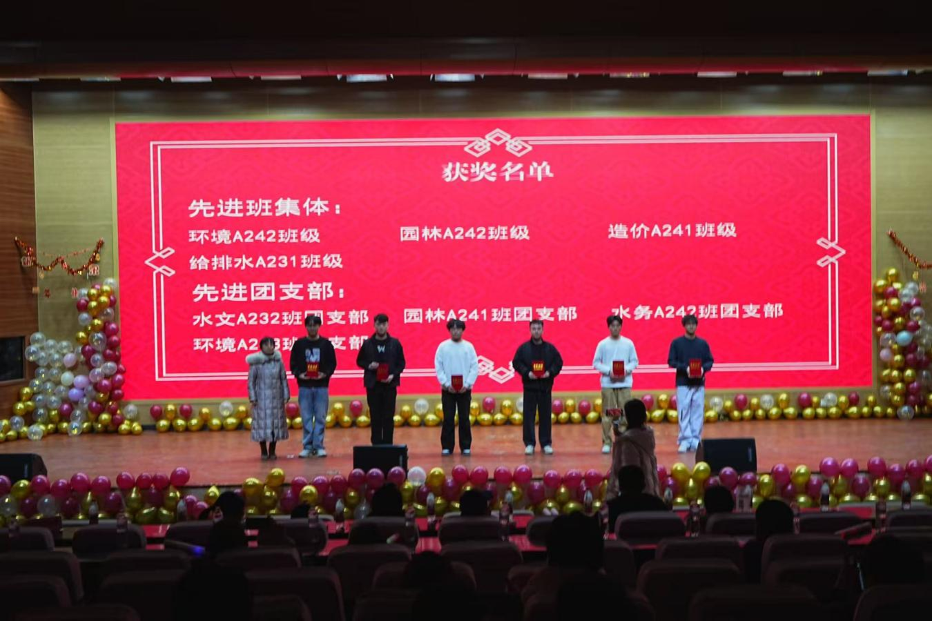 晚会现场,资源与环境系对在2025年度表现突出的学生集体及个人进行表彰。希望同学们秉承“上善若水,海纳百川”的校训,践行“团结吃苦,奉献创新”的水院精神,以青春之我谱写奋斗的华章,为学院内涵式高质量发展贡献青春力量。