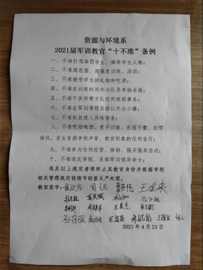 接学院通知以来,我系制定了严格、详尽的选拔标准,从学习成绩、思想状态、责任担当、民意测评等多个方面进行细致选拔;每个参训教官都庄重地签下了“资源与环境系教官十不准条例”责任状,为学生教官划下清晰红线,防患于未然;系党总支副书记以讲座的形式从教官角色意义、具备条件、后期影响、责任担当等多个方面进行了深入浅出、通俗易通的教育引导。新一届资源与环境系教导中队选拔严格、管理规范、质量上乘,必将促使我系2021届新生军训工作再上新台阶。