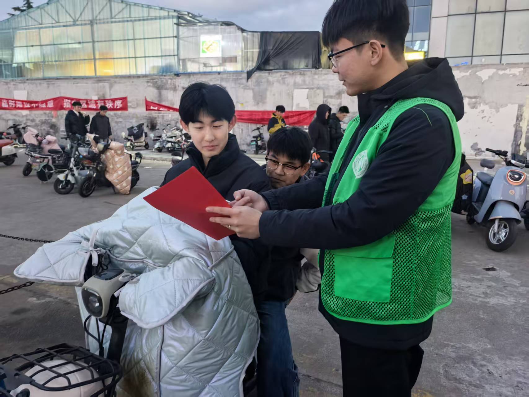 路口值守护平安,规范秩序树新风。宿舍园区各主要出入口,学生志愿者以耐心礼貌的态度劝阻逆行、超速行驶等不文明交通行为;同时主动排查园区周边电动自行车乱停乱放现象,逐一将违规停放车辆规范规整至指定停车区域。这一务实举措不仅快速改善了宿舍园区出入口的通行秩序,更以实际行动传递了文明停放、安全通行的理念,带动周边师生自觉规范出行行为。