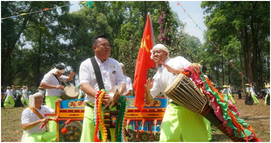 ▲盈江县德昂族泼水节的“象鼓舞”展演活动。每逢泼水节,在德宏州“大泼三天,小泼七天”的传统中,傣族和德昂族群众尽情享受民族文化的“拼盘”盛宴。(图片来源:“美丽盈江”微信公众号)
